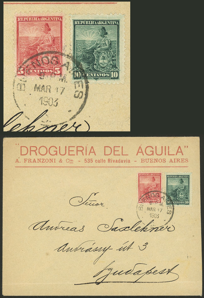 GJ.264 + 222, cover with corner card of drugstore, sent from B.Aires to Budapest (Hungary) on 17/MAR/1903, franked with 15c. (GJ.222 + 264 perf 11½ x 12¼), arrival backstamp, mixed perfs are very scarce on cover + rare destination! (Image) (Image-02)