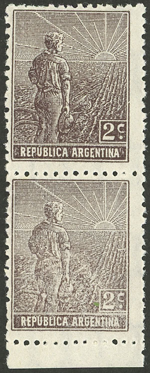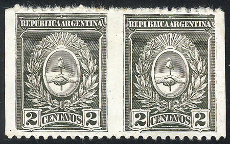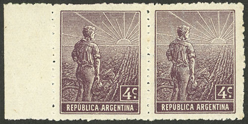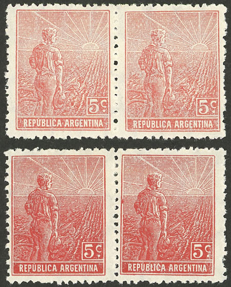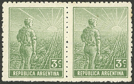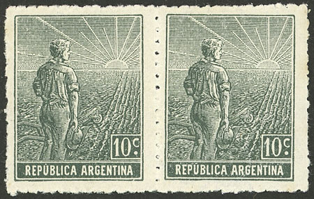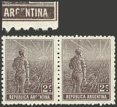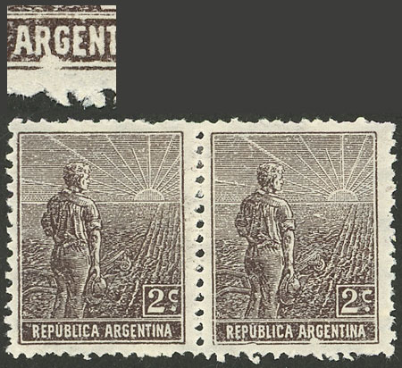 pair, one with VARIETY: Frame below the "R" of ARGENTINA broken, catalog value of normal pair US$10 (Image)