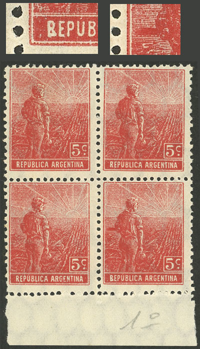 marginal block of 4, one with varieties: "BEPÚBLICA" + sleeve of the shirt broken, VF (Image)
