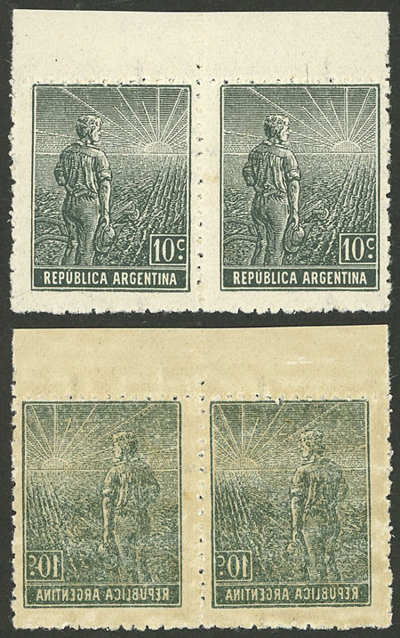 marginal pair, the bottom stamp with VARIETY: Dry impression (little ink), the top one with normal impression (Image)