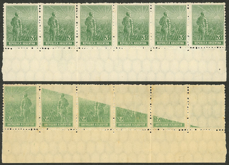 marginal strip of 6, with VARIETY: partial offset impression on back (Image)