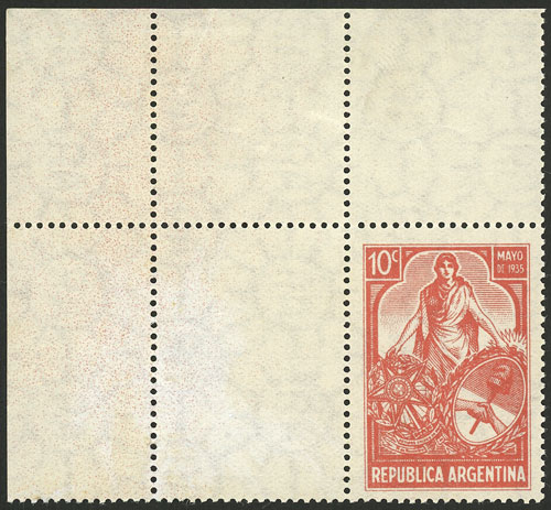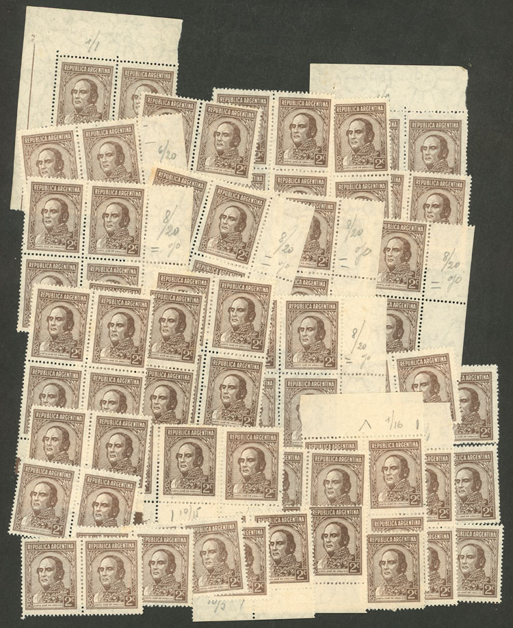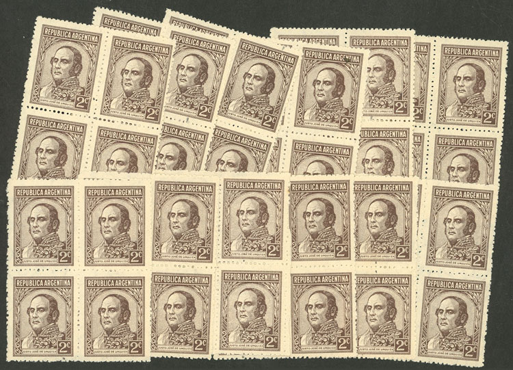Urquiza: large lot containing blocks of 4, all with VARIETIES, fine to VF quality (Image)