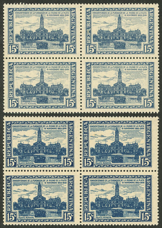 blocks of 4 in the 2 catalogued colors: blue and blue + slate blue and slate blue, both of VF quality (Image)
