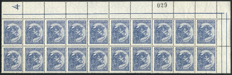 corner block of 20 with "4" and sheet number, 2 or 3 with minor defects, most MNH (Image)