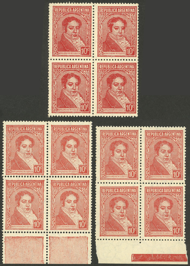 GJ.796/98, 10c. Rivadavia, typographed, type A + B perf 13¼x13 + type B perf 13¼, the 3 in blocks of 4, VF quality (Image)