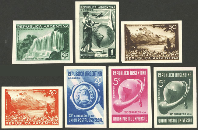 other values, 7 PROOFS printed on thick chalky paper, including one example printed on both sides (25c. emerald green and 5c. rose on back, printers waste) (1958 Kneitschel, volume II, page 725), VF (Image)