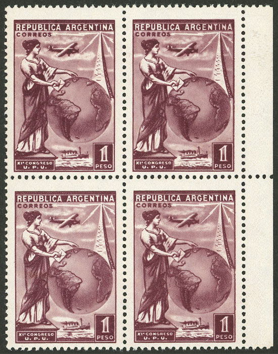 $1 Communications (airplane, ship, globe), marginal block of 4, excellent quality (Image)