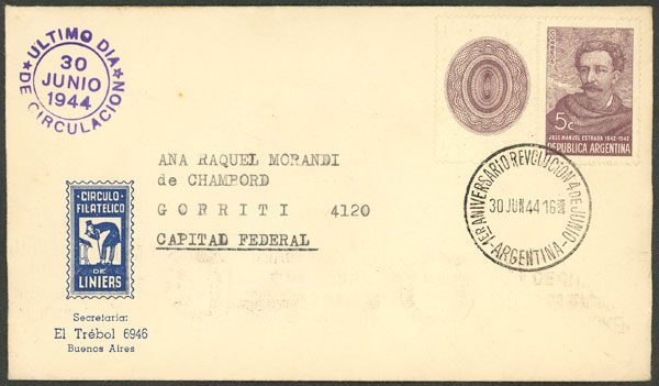 GJ.856CZ, 5c Estrada with left label, franking a cover used on 30/JUN/1944, with mark for last day of use (Image)