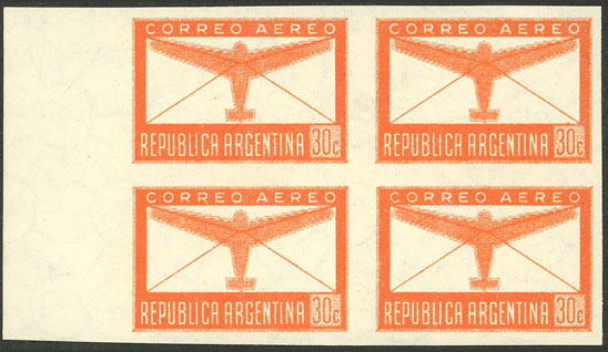 airmail, imperforate block of 4 with sheet margin, excellent quality (Image)