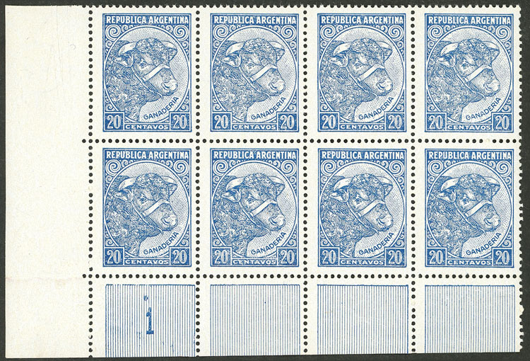 light blue, block of 8 with sheet corner with "1" (Image)