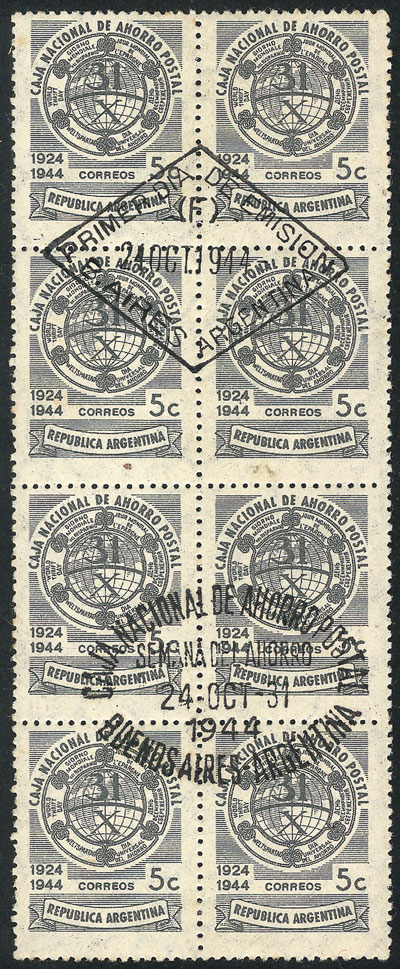 block of 8, cancelled "PRIMER DÍA" + "CAJA NACIONAL de AHORRO POSTAL", very nice (Image)