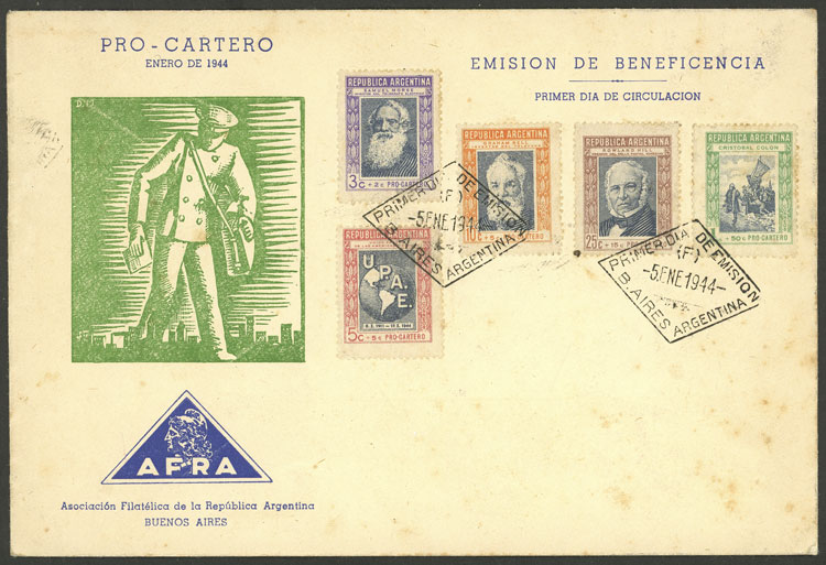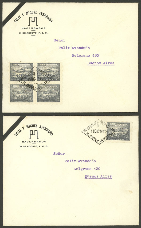 block of 4 + single, with first day postmark on covers with corner card "Félix y Miguel Avendaño - Hacendados" (Image)