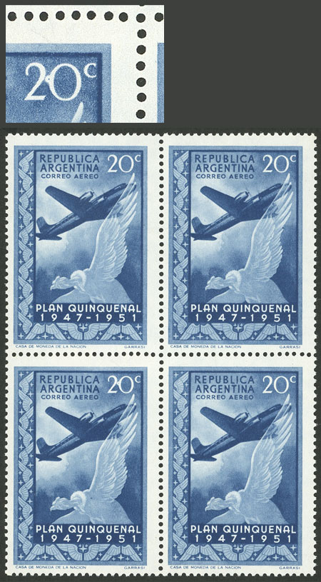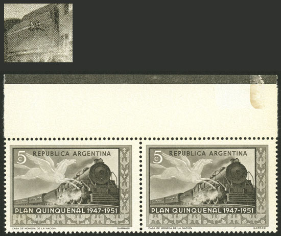 GJ.1003a, marginal block of 4, with complete double impression in the left stamps, and partial in the right stamps, variety produced by the paper´s "flapping" when coming into contact with the printer roll (Image)