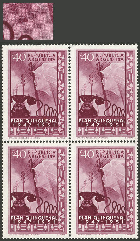block of 4, one with variety: Color spot above the telephone cable (Image)
