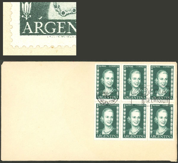 GJ.1012a, block of 6, one with VARIETY: "R" of ARGENTINA with accent, on cover with first day postmark (Image)