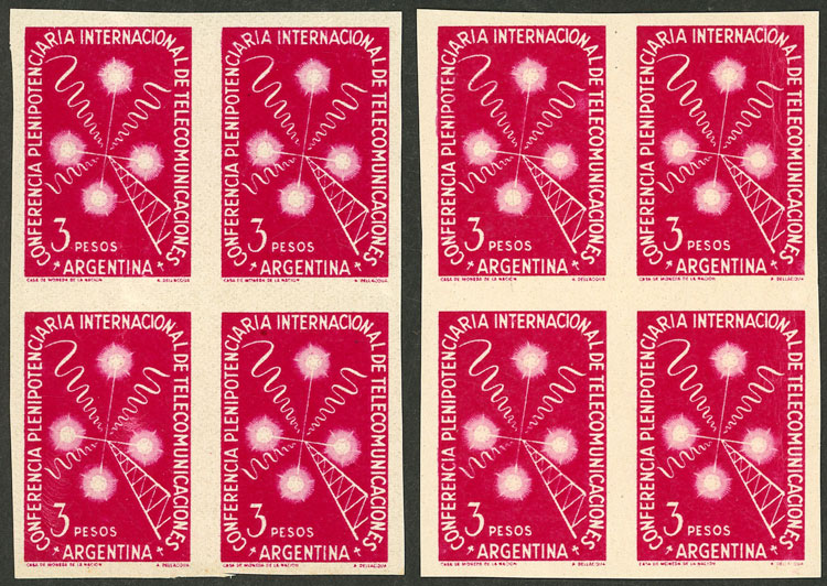 2 blocks of 4, PROOFS on different papers (medium and thin, in rose-red and light rose-red, respectively), light crease (Image)
