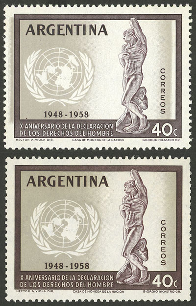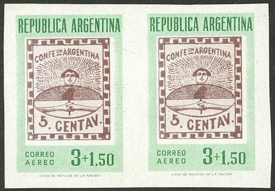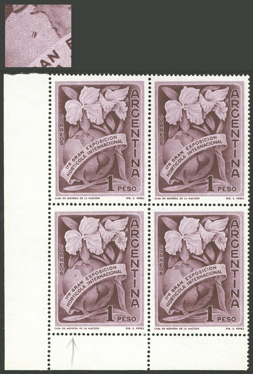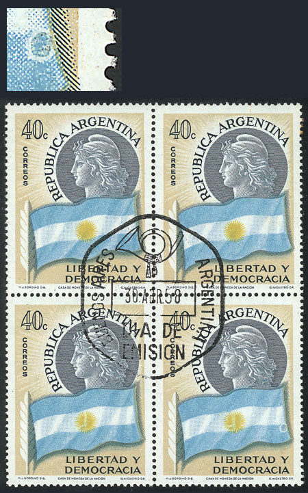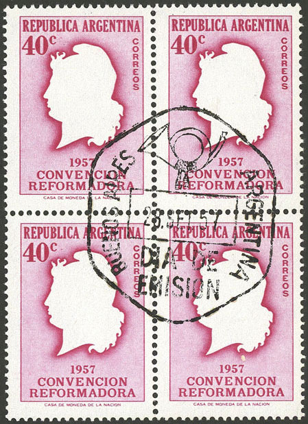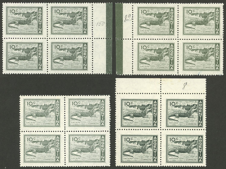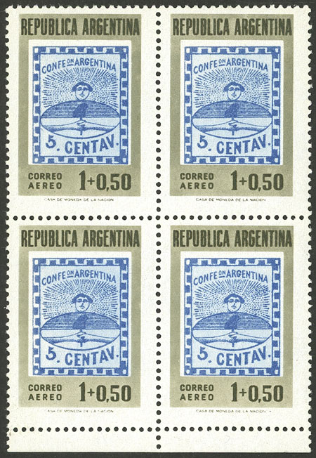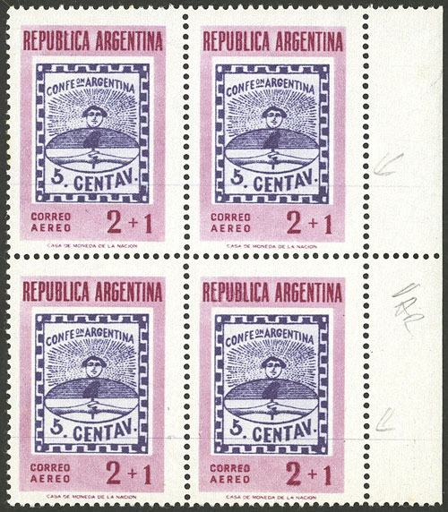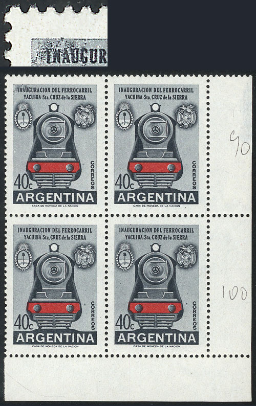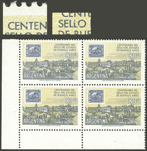 block of 4, the right stamps with VARIETIES: top stamp, first "N" of CENTENARIO incomplete, and bottom stamp, second "L" of SELLO incomplete (Image)