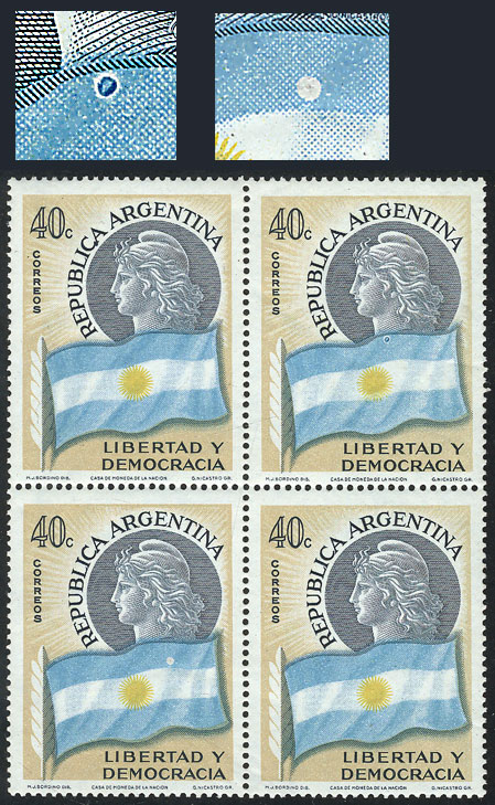 block of 4, 2 with VARIETIES: top right, blue spot on the flag, and lower left, white circle on light blue strip, VF (Image)