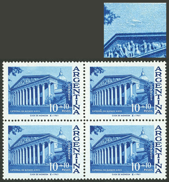 block of 4, one with VARIETY: Clouds in the sky (plate flaw before the retouch) (Image)