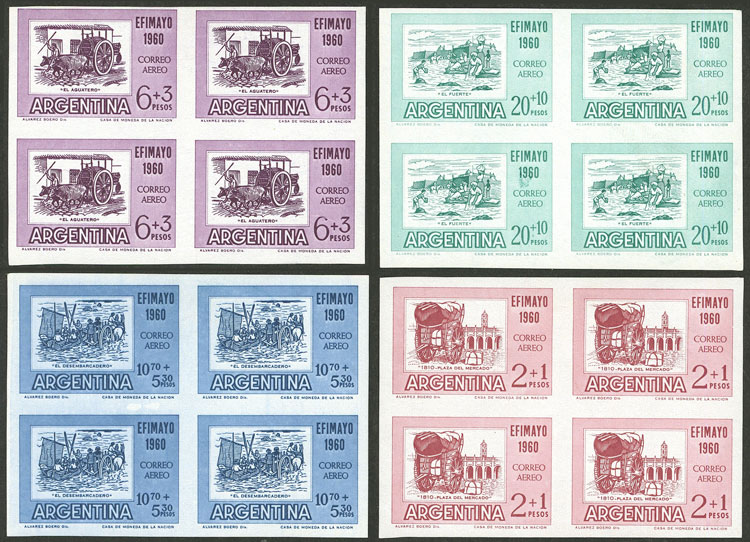 GJ.1183P/1186P, cmpl. set of 4 values in IMPERFORATE BLOCKS OF 4, including the value $6+3 in imperf block of 4 lilac (proof), catalog value US$240, VF
