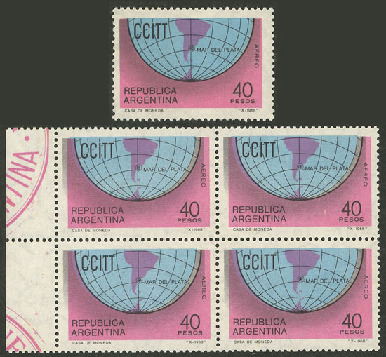 Globe / map, marginal block of 4 with VARIETY: colors very shifted, along a normal example for comparison (Image)