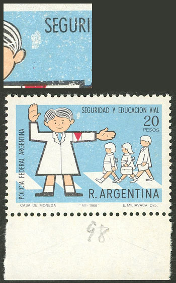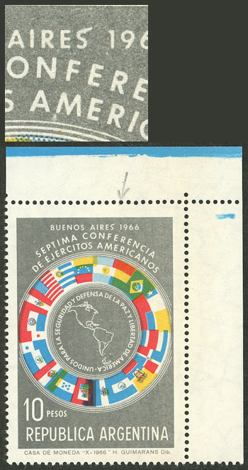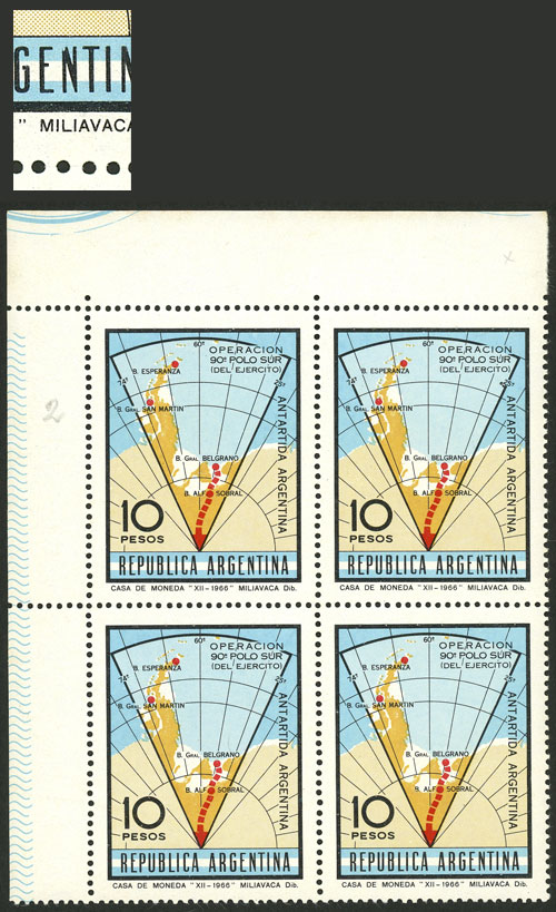 Map of Antarctica, corner block of 4, one with VARIETY: first "N" of ARGENTINA broken (pos.2) (Image)