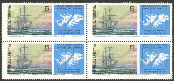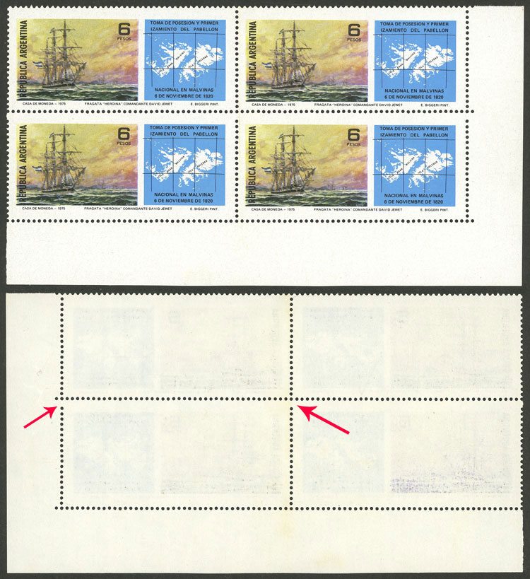 Ship + Map of Falkland Islands/Malvinas, corner block of 4 with perforation variety (salto de peine) (Image)