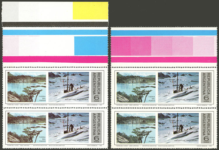 GJ.1709CA + 1709ACA, Tierra del Fuego / Antarctica, pairs with top labels printed on chalky paper + on the scarce unsurfaced paper, superb (Image)