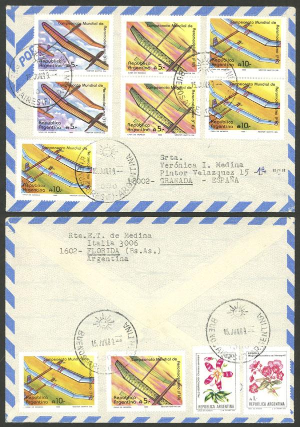 GJ.2443/45 + other values, cmpl. set in pairs and other values franking a cover from Buenos Aires to Spain on 15/JUN/1989 (Image)