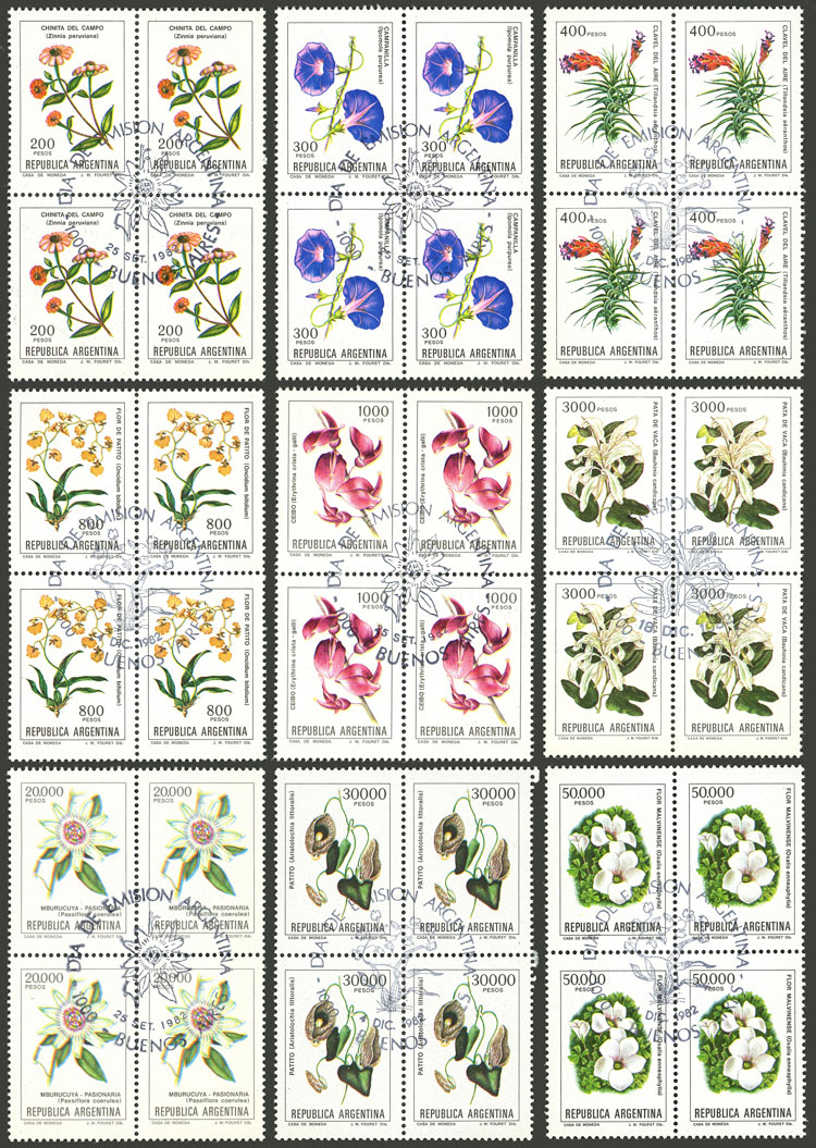 + other values, Flowers (Pesos Ley 18188), 9 different values of the set in blocks of 4 with first day postmark (Image)