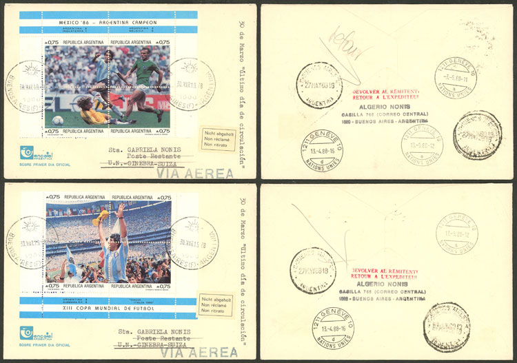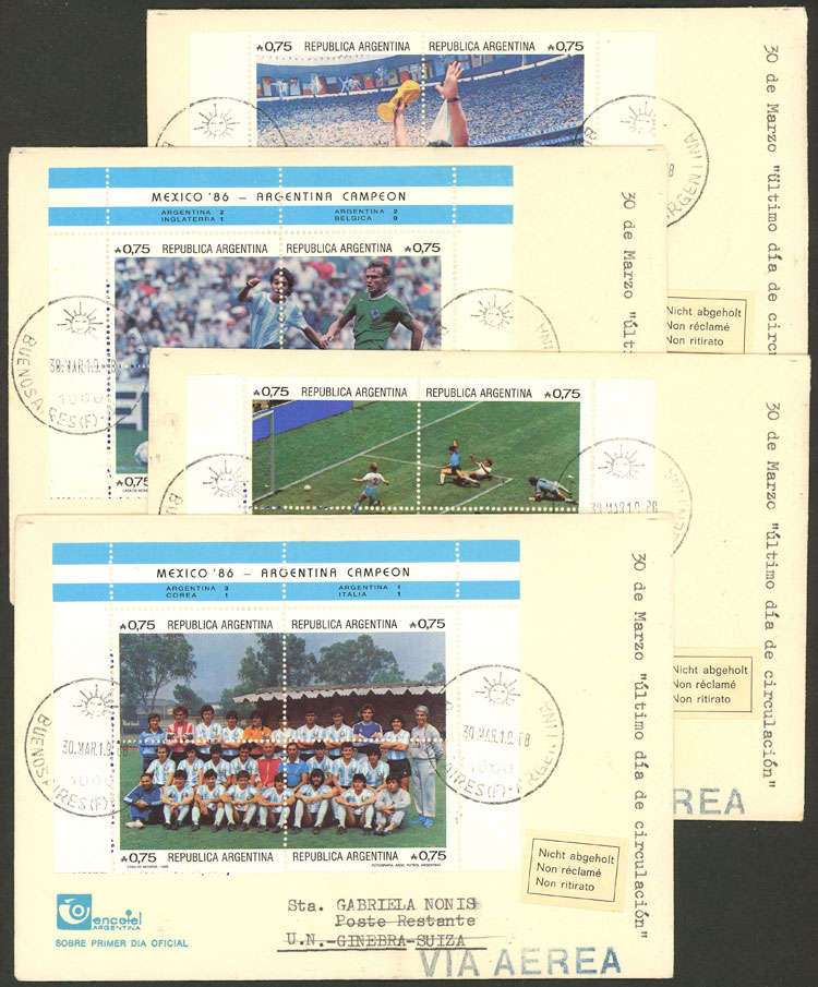 GJ.2301/2316, Argentina champion of Mexico 86 Football World Cup, cmpl. set of 16 values, franking covers used from Buenos Aires to Switzerland, returned to sender (Image) (Image-02)