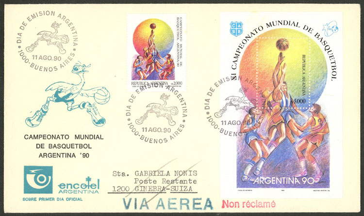 GJ.2497 + HB91, Sport / basketball, cmpl. set franking a cover sent from Buenos Aires to Switzerland, with first day postmark (Image) (Image-02)