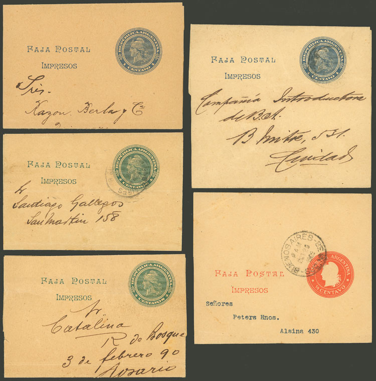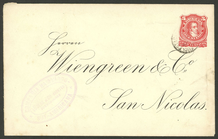5c. envelope, wove paper with "Spicer Brothers" wmk, sent from Buenos Aires to San Nicolás on 13/NO/1889, on back it bears several marks including blue arrival, VF