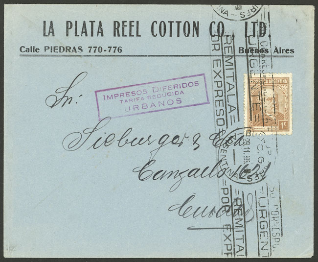 used in Buenos Aires in NO/1938, franked with 1c. Sarmiento, with mark "IMPRESOS DIFERIDOS - tarifa reducida - URBANOS" (Image)