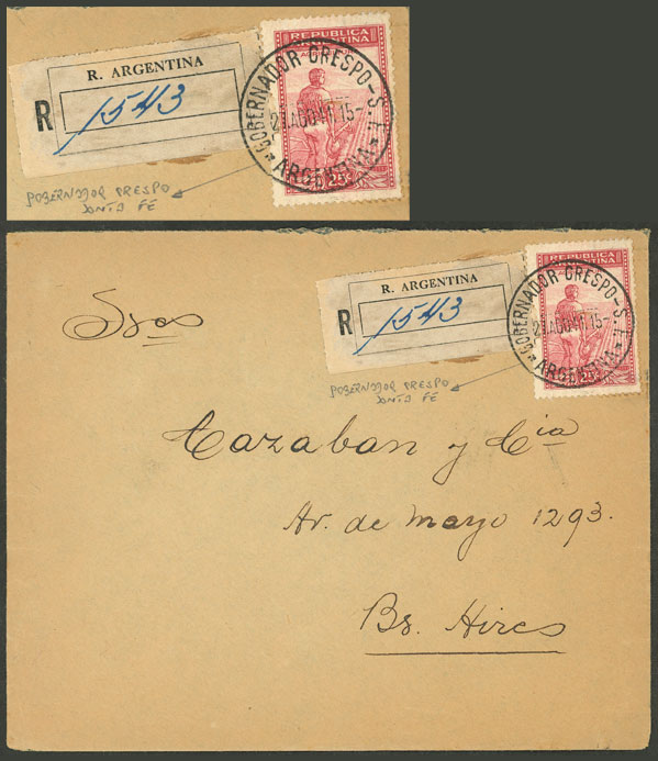 Registered cover with cancel of GOBERNADOR CRESPO (Santa Fe) sent to B.Aires on 27/AU/1941 (Image) (Image-02)