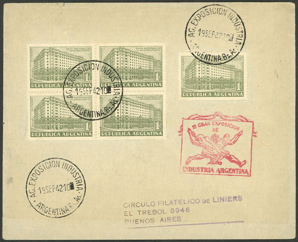 with cancel of EXPOSICION INDUSTRIA sent to Círculo Filatélico de Liniers on 19/SE/1942, franked with 5c. (GJ.855, block of 4 + single), with red handstamp of the exposition and arrival backstamp (Image)