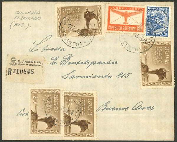 Registered cover sent from COLONIA EL DORADO (Misiones) to B.Aires on 10/JUL/1952, franked with $1.50 (GJ.978 x4 + 857 + 888) (Image)