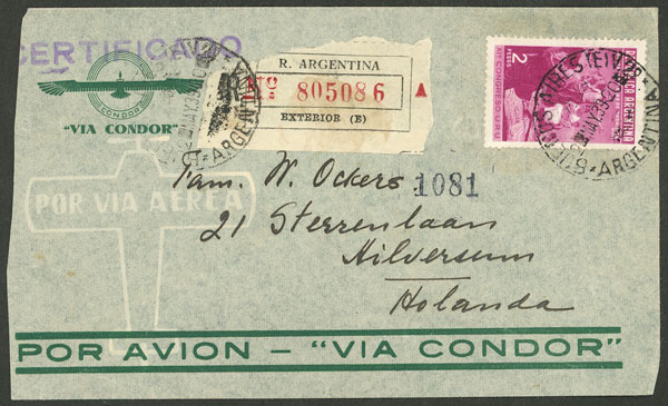 Registered cover sent "via CONDOR" from B.Aires to Netherlands on 2/MAY/1939, franked with $2 (GJ.829 alone) (Image)