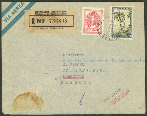 Registered cover sent by airmail from B.Aires to France, franked with $5.05 ($5 Iguazú falls + 5c. San Martín), small spot on the gum, low start