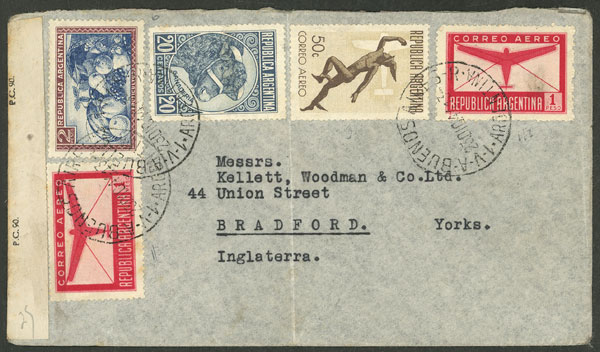 cover sent from B.Aires to England on 25/DE/1944, franked with $4.70, censored, minor faults (Image)