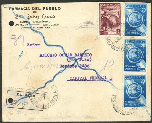 Cover with corner card "Farmacia del Pueblo", postmarked "PUERTO SAN JULIÁN" and sent by express mail to Buenos Aires on 5/JUN/1939, franked with $1.60 (GJ.828 + GJ.825 strip of 3), small defects. (Image) (Image-02)