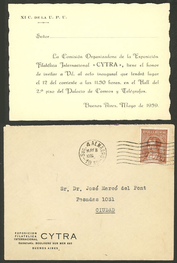 Cover sent by the Organizing Committee of the CYTRA Intl. Philatelic Exposition to Dr. José Marcó del Pont on 8/MAY/1939, including an invitacion card to the opening event (Image) (Image-02)