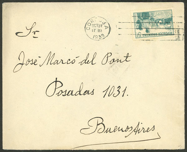 sent from Córdoba to Buenos Aires to Dr. Marcó del Pont on 27/OC/1939, with a long letter that includes comments about the political figures of the province (the governorDr. Sabattini, and about Dr. Castillo, a candidate for the following elections),