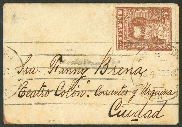 Miniature cover addressed to "Fanny Brena - Colon Theater" (one of the most renowned figures of Yiddish theater especially in comedy) (Image)
