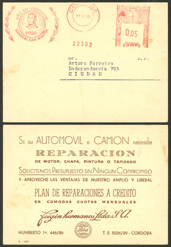 Advertising card used in Córdoba on 13/MAY/1950, with meter postage of 5c., the cancel commemorating General San Martín, very nice (Image)