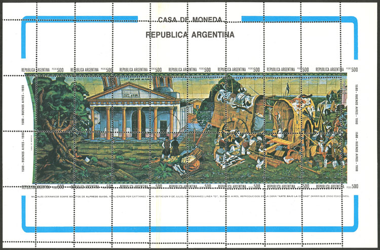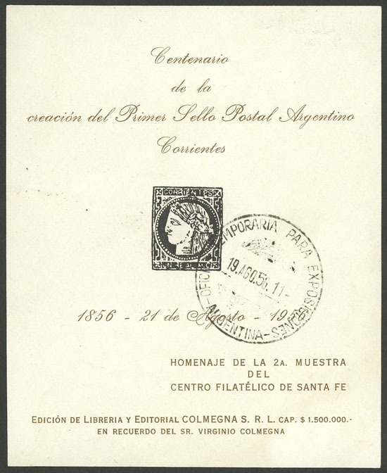 Commemorative sheet edited by Librería y Editorial Colmegna S.R.L., commemorating the centenary of the first Argentine stamp, with postmark of the Exposition, VF quality (Image)
