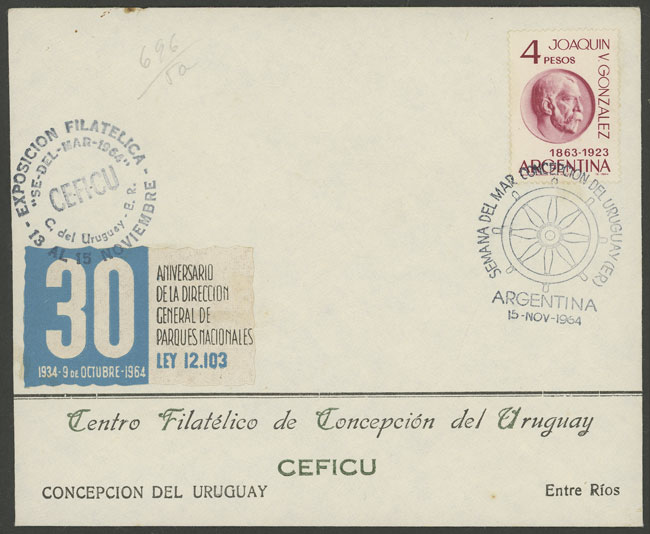 Cinderella of 30th anniversary of National Parks, on cover with handstamp of Sea Week held in Concepción del Uruguay NO/1964 (Image)