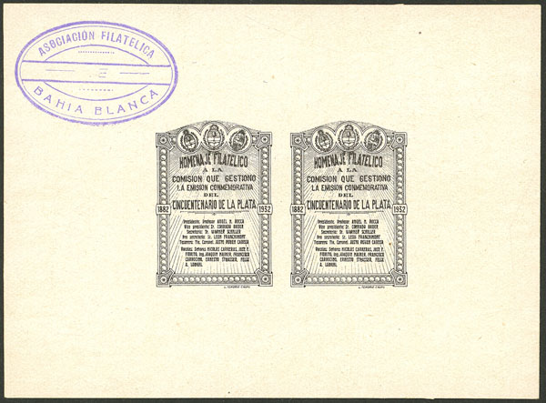 die proof of cinderella commemorating "Commission that managed the commemorative issue for 50th ANNIVERSARY OF LA PLATA", in pair, very nice (Image)