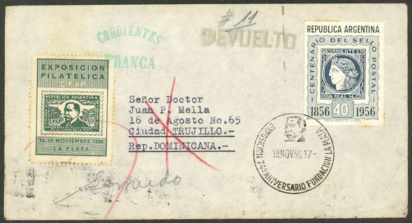 Plata 74th anniversary: Cover sent from the philatelic exposition to Dominican Republic in NO/1956, with a cinderella of the expo, and arrival backstamp, returned to sender