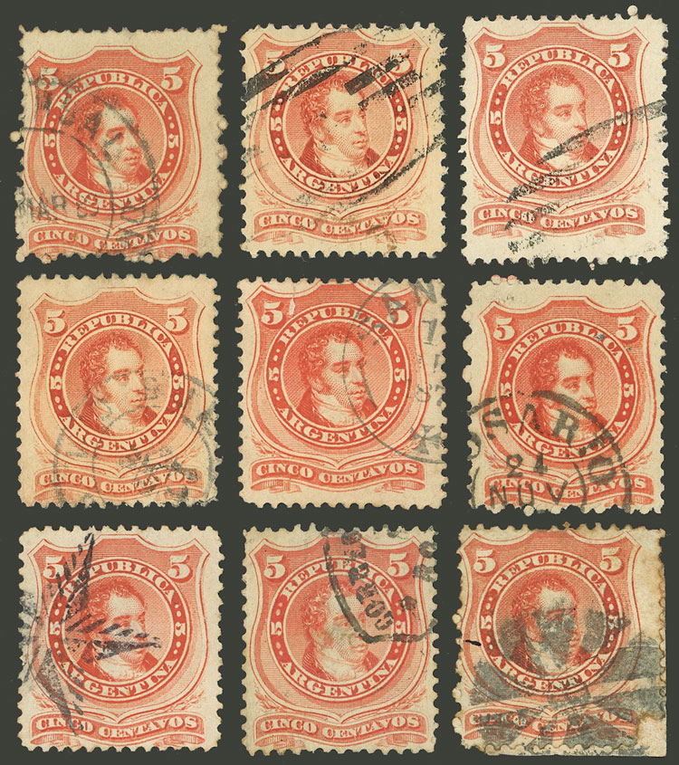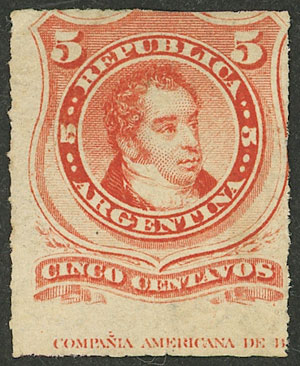 5c. Rivadavia, rouletted, key value of the set with VARIETY: printer imprint in the lower sheet margin, rare and of excellent quality (Image)
